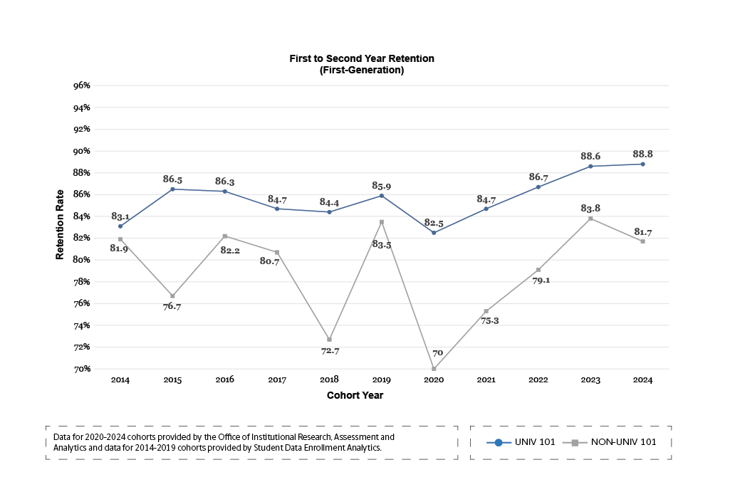 UNIV 101 students have consistently had higher one-year retention rates, six-year graduation rates and first-year GPAs than students who do not enroll in the course.